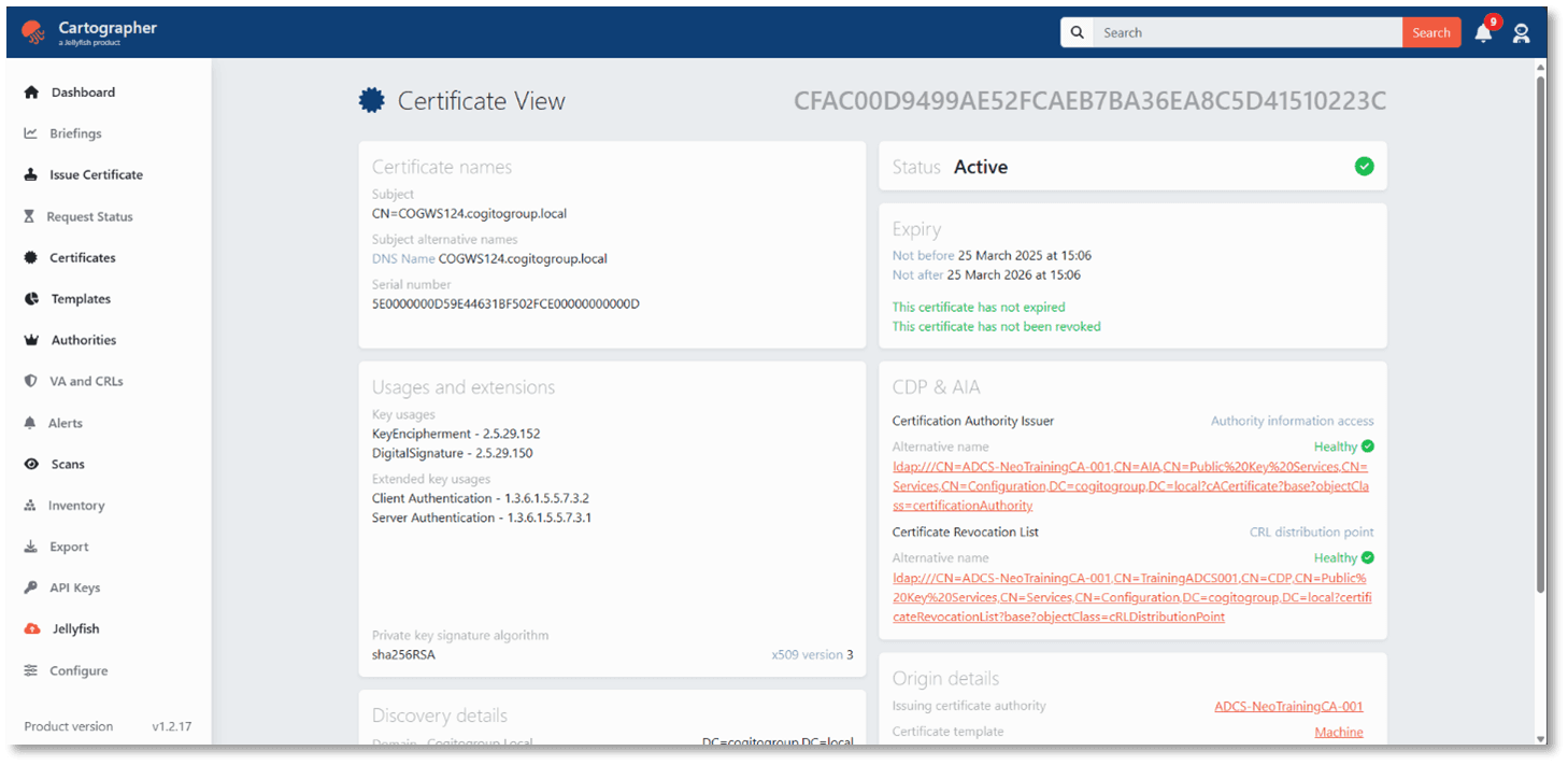 Cartographer has several integrations with Cogito Groups flagship Certificate Lifecycle Management product: Jellyfish. Synchronize and import certificates into your Jellyfish tenancy.