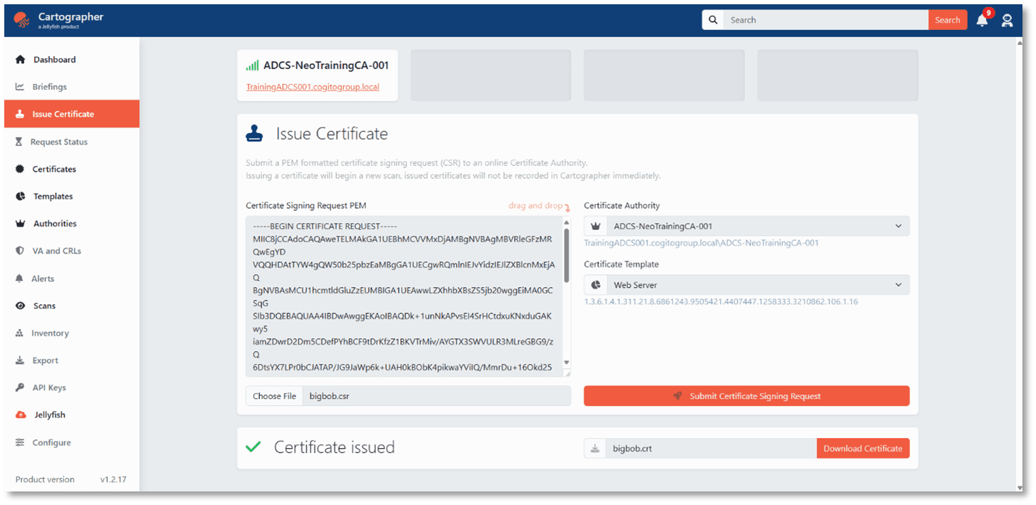 - Immediate Certificate Issuance and Revoke: Issue and revoke certificates from any connected Certificate Authority directly from the unified Cartographer portal.