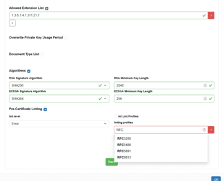 Pre-certificate linting is an effective solution for ensuring compliance with predefined profiles. However, it does not offer the capability to enforce specific values within certificate data. To address this, pre-certificate linting can be combined with CSR Rules and Domain Whitelisting for enhanced control and customisation.
