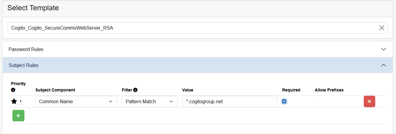 CSR rules are used to define a set of requirements that a Certificate Signing Request (CSR) must meet to be issued by a template. Restrictions control what values can be present in a CSR. Rules can be made by providing a set of hardcoded values or regular expressions.