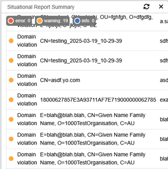 Domain Violations is the simplest and easiest to use of Jellyfish’s filtering techniques. Operators may specify a tenancy wide list of accepted domains that users can issue certificates for, but not hard limit those being the only ones supported. Domain violations then shows what has been issued outside of this.