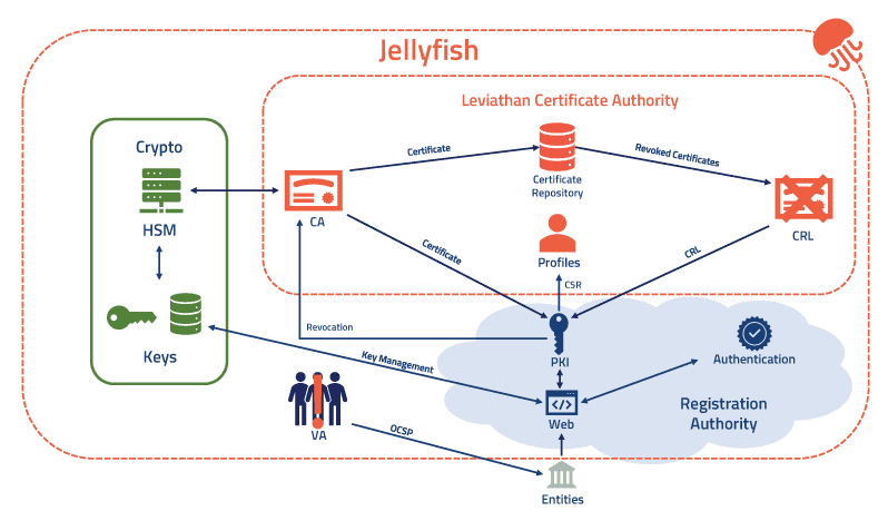 Leviathan CA and Jellyfish are built with microservice architecture where each component operates in complete independence and can work in isolation or integrated into Jellyfish setup. This allows constraint scaling satisfying a simplistic setup for smaller organisations or multi-region deployments for larger enterprises.