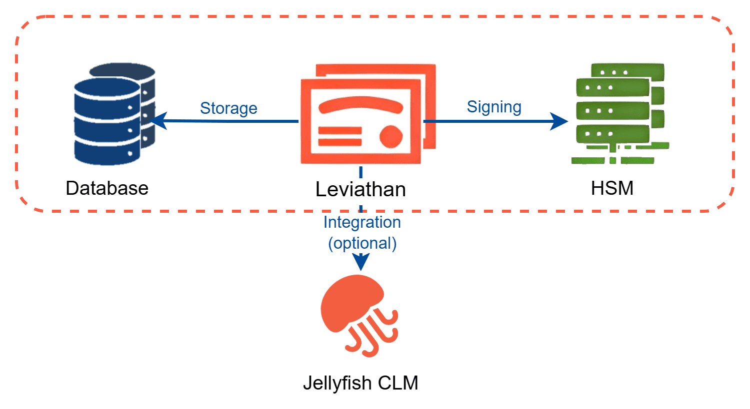 Leviathan’s architecture is built around modular, interoperable components. The CA forms the core application, while Jellyfish Services can be optionally integrated for full certificate lifecycle management. Database support includes PostgreSQL, MySQL, and SQLite, compatible with high-availability and clustered configurations. For secure key storage and signing, Leviathan integrates with HSMs such as Entrust nCipher, Thales Luna, Utimaco CSe/Se and SoftHSM via PKCS#11/Cryptoki standards.