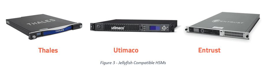 Jellyfish also supports Luna and nShield for use with Smartcard management for the storage of the master (factory and customer) keys.